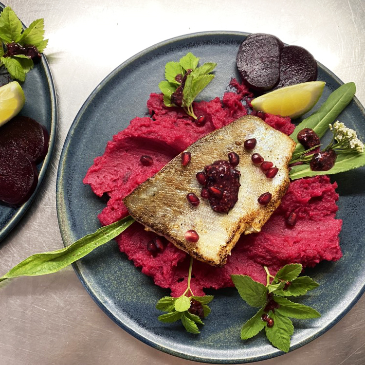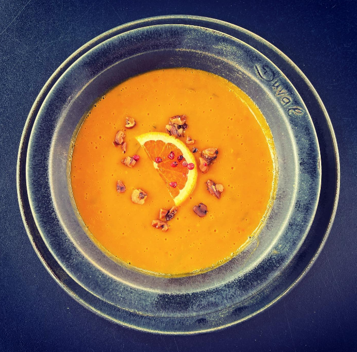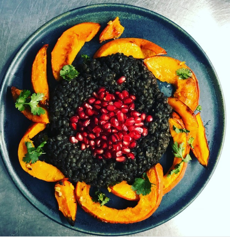 gebackener Kürbis an Belugalinsen-Granatapfelsalat